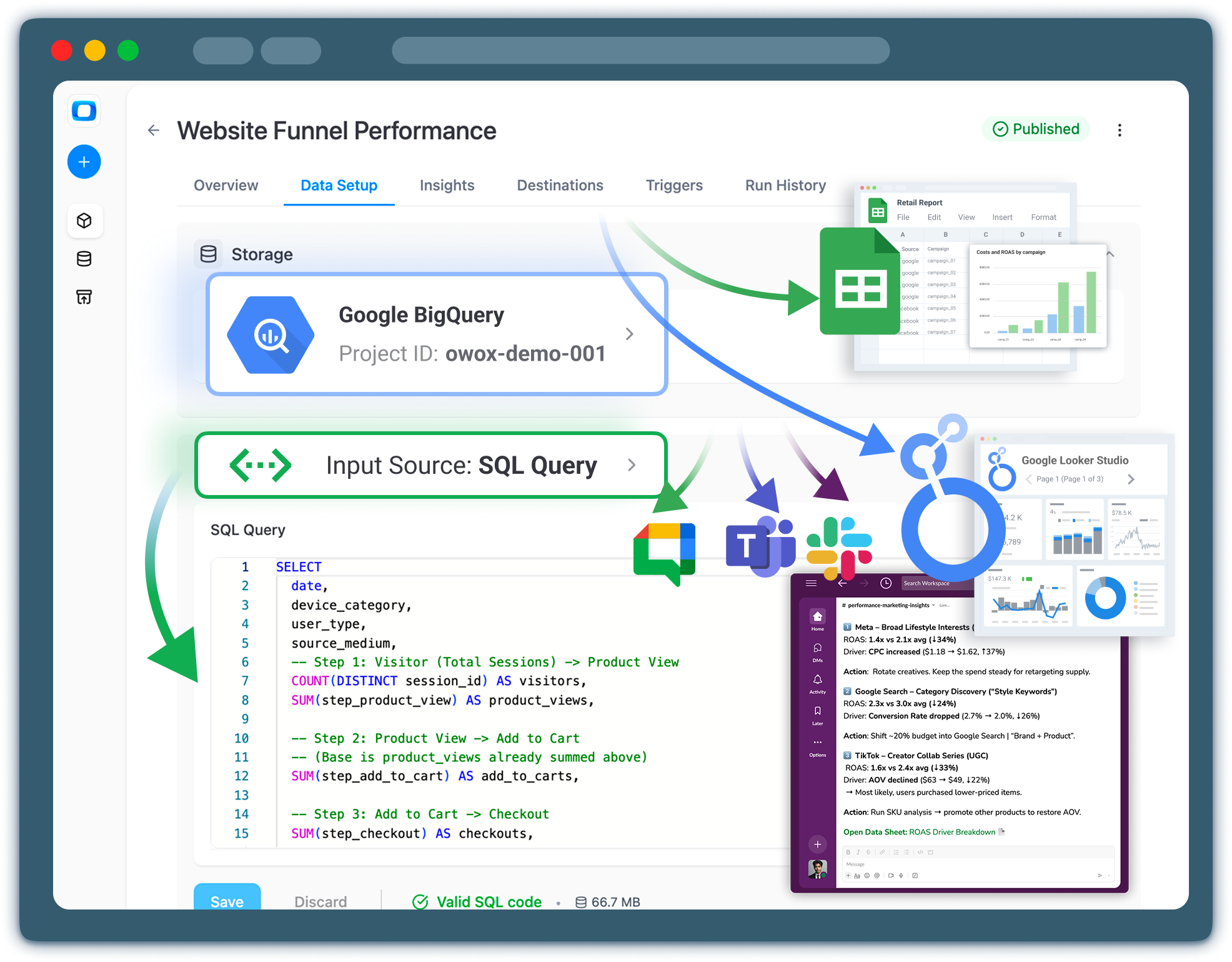 Enable the Looker Studio toggle on any Data Mart. Connect using the OWOX connector and a JSON config token. Unlike Sheets (push mode, static between runs), Looker Studio pulls live data from BigQuery every time the report opens.
