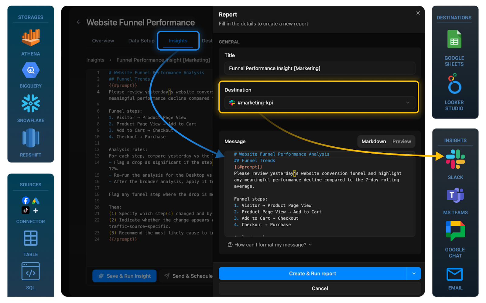 Expose curated Snowflake views to BI tools like Looker Studio or Google Sheets using read-only roles for controlled access. Build standardized dashboards and reporting templates, and configure AI-driven alerts in Slack or Microsoft Teams to deliver proactive performance insights where teams collaborate.
